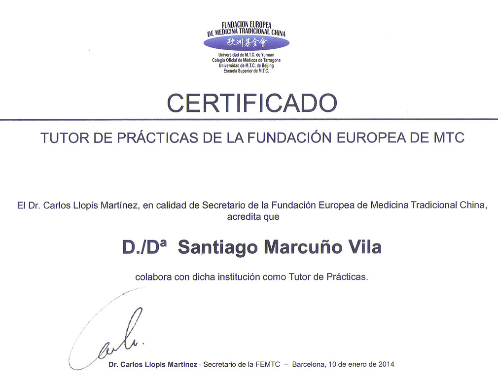 - Diplomado Grado A (Licenciatura) en Medicina Tradicional y Acupuntura por la Universidad de Medicina Tradicional- China (PEKIN) (+ info) y la Fundación Europea de Medicina Tradicional China (Universidad de Pekin, Universidad de Yunnan, Colegio de Médicos de Tarragona, Escuela Superior de MTCh.) (+info)